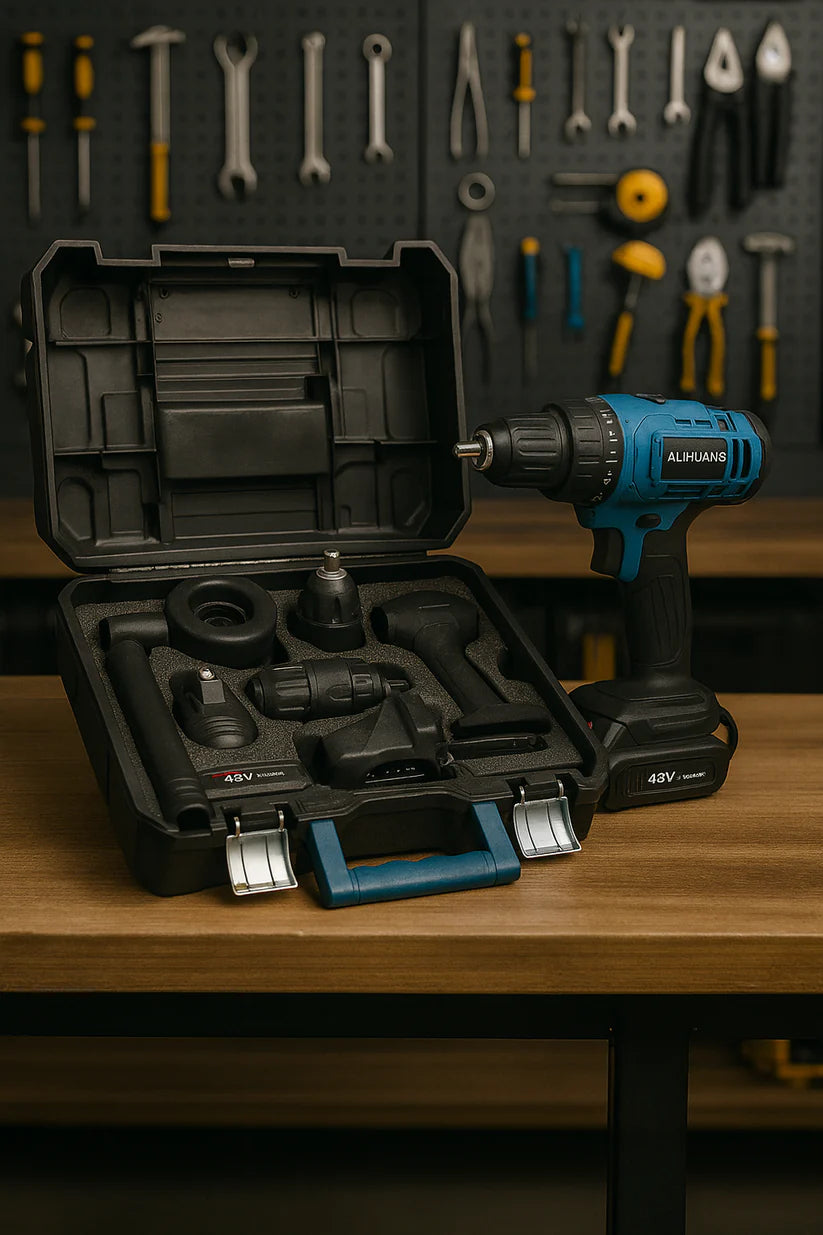 Taladro multifunción, 4 cabezales (sierra, sopladora, taladro percutor y atornillador de impacto), dos baterías, cargador rápido y maletín con accesorios.